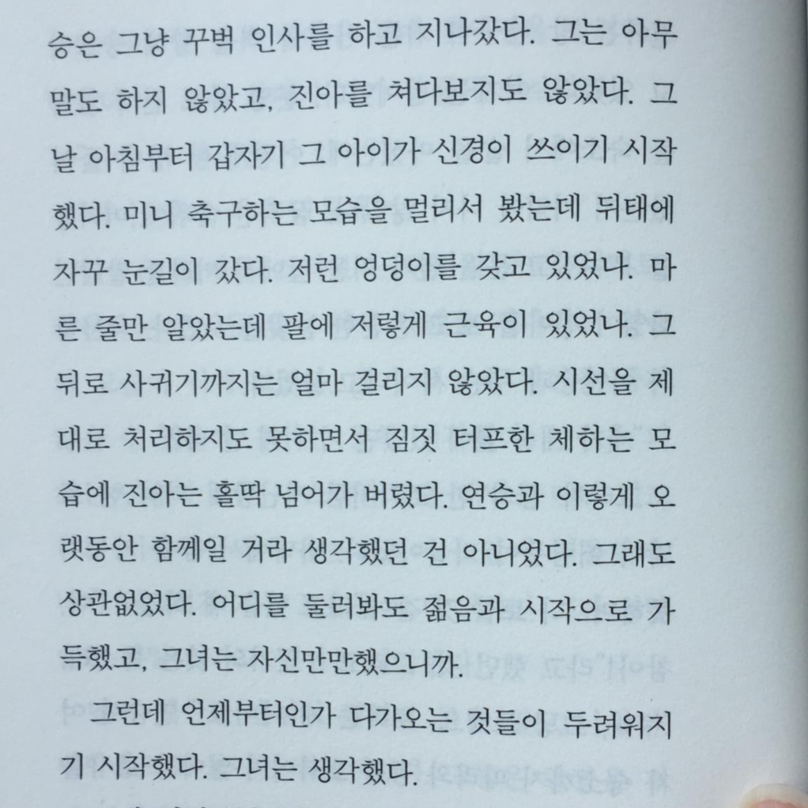 소설집 중 첫 이야기는 연승과 진아가 대학시절 활동했던 동아리 선배네 집에 초대받아, 만나는 내용이었다.