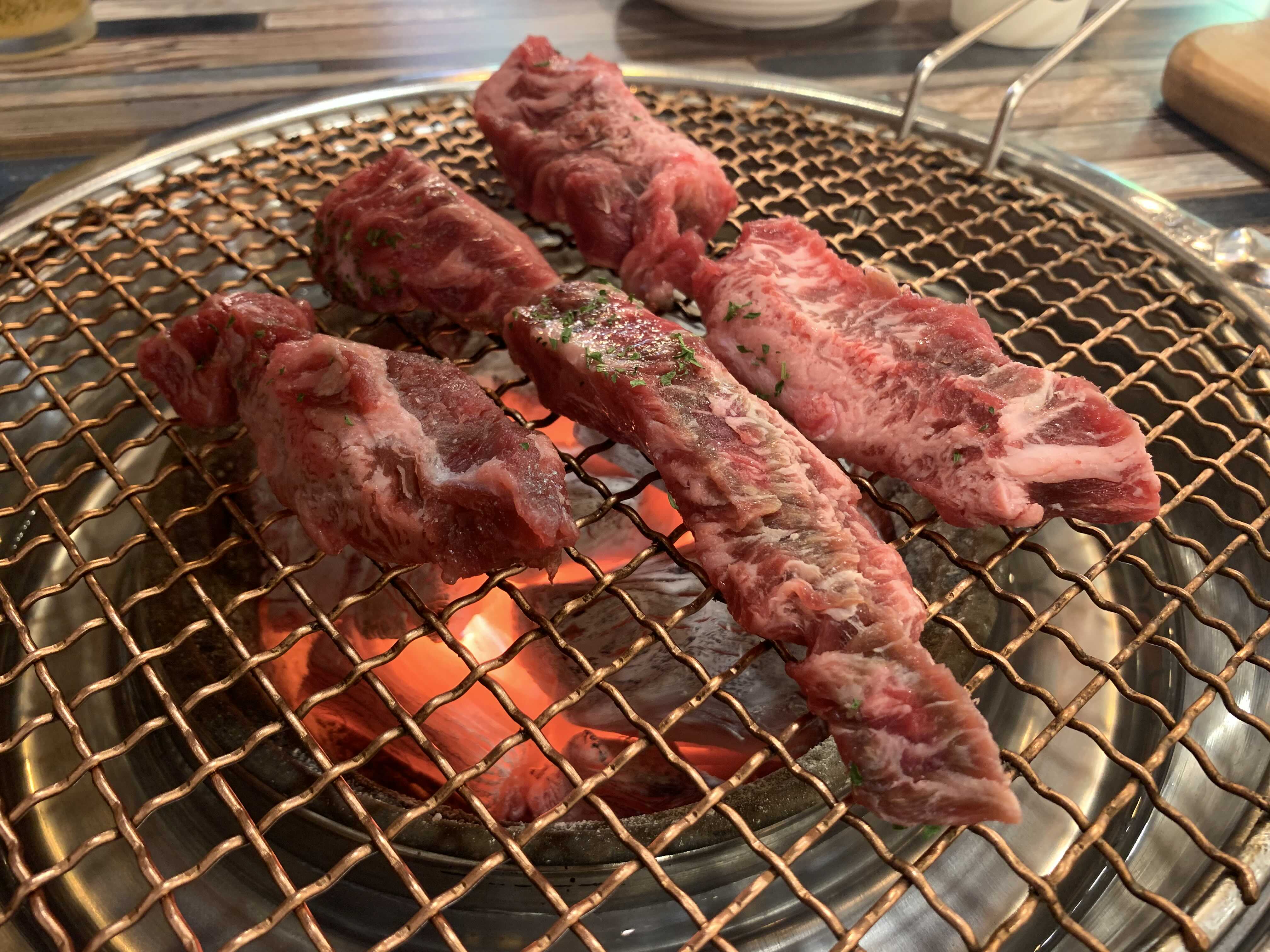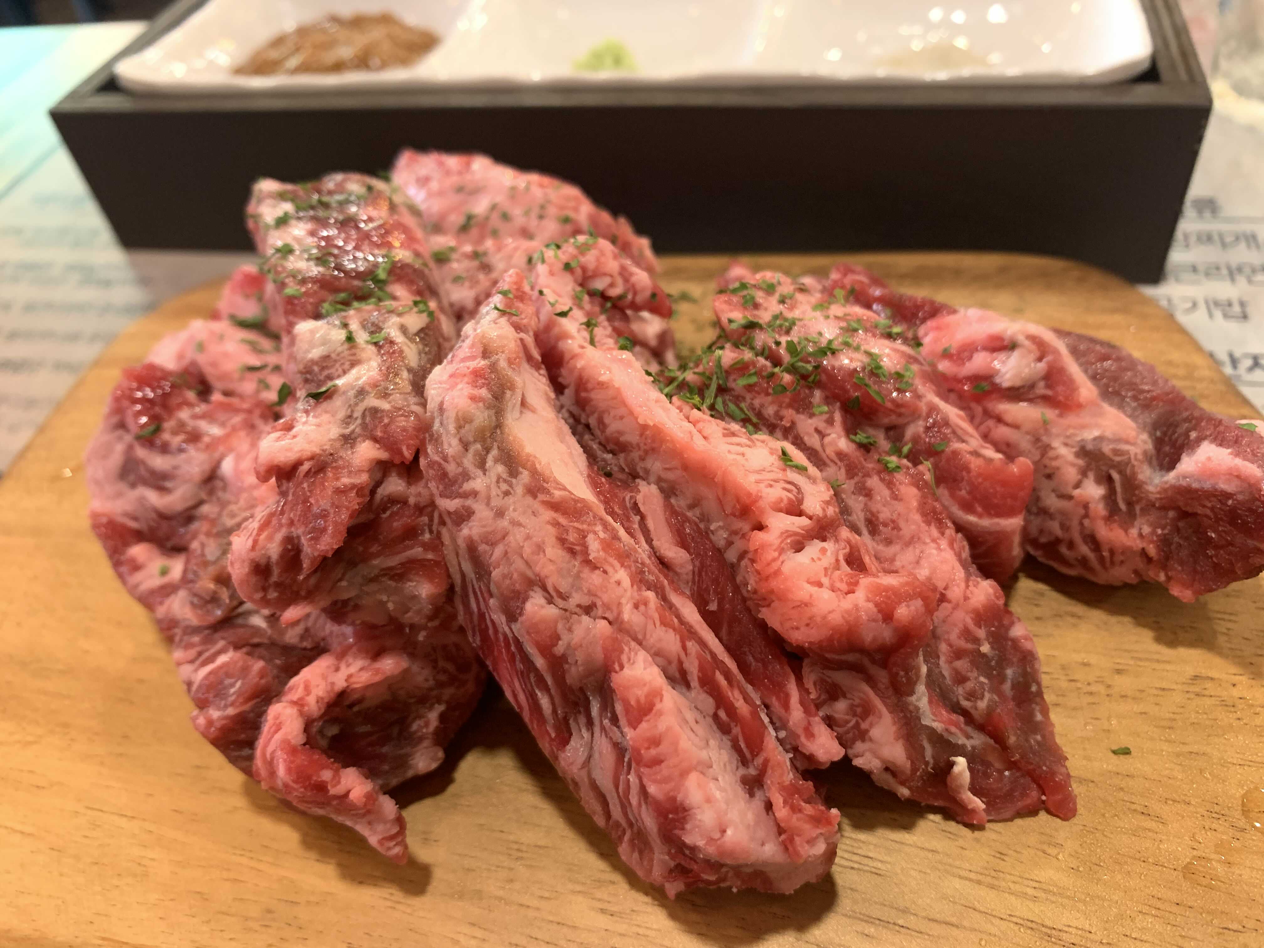 고기는 수입산이지만, 100g에 4,990원으로 저렴해 보이기는 했다. 숯 값이 3천 원, 따로 있었다. (메뉴판을 못 찍었다. 메뉴가 많지 않고, 소고기와 돼지고기 중에 고르면 된다.) 특수부위라고 되어 있어서, 뭔지 물어보니 갈빗살이라고 했다. 일단 기본 500g을 주문했다.