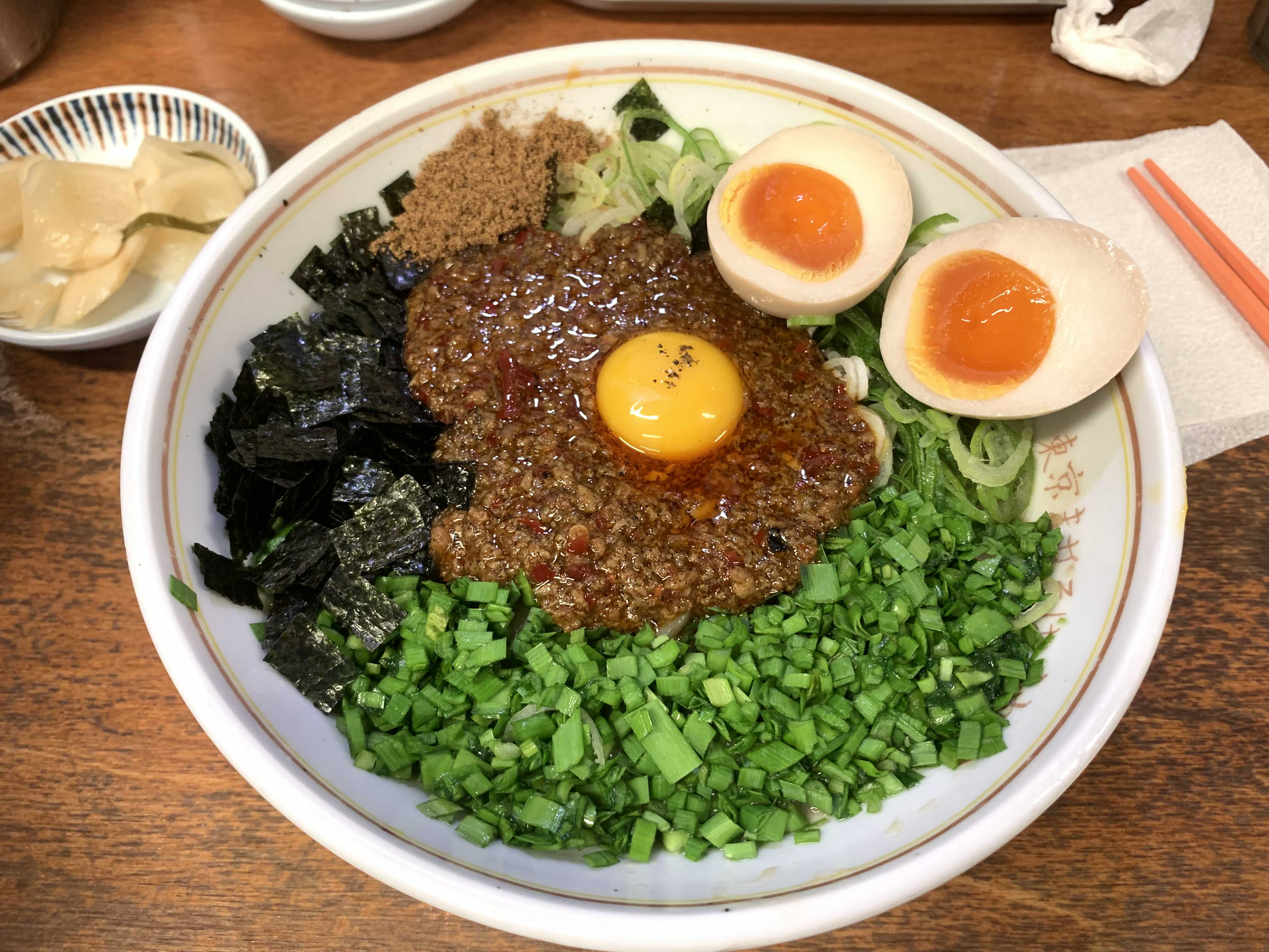 마제소바에는 반숙 계란(아지타마고)을 추가 토핑으로 주문했다. 이것만큼은 사진 제대로 찍어야지-하고는 차슈도 올려본다.
