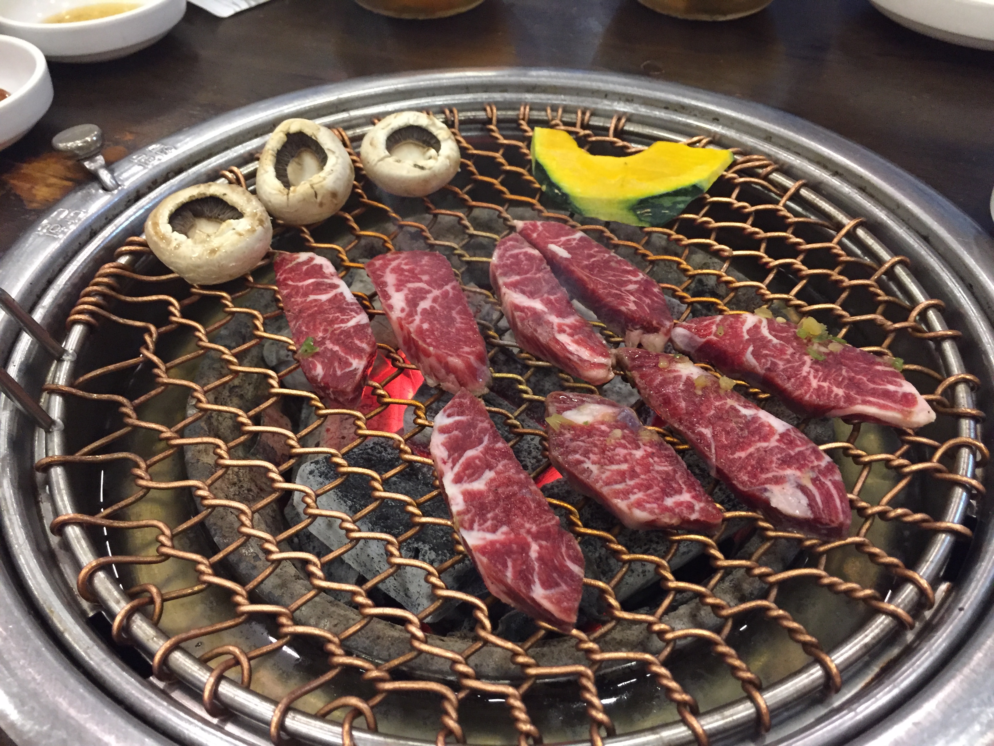 먼저 버섯을 올리고 고기를 구워본다.