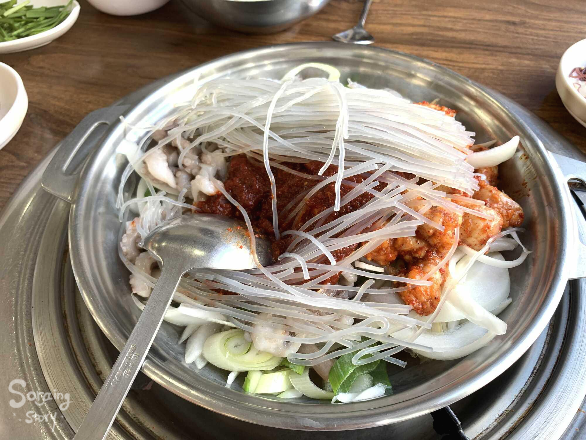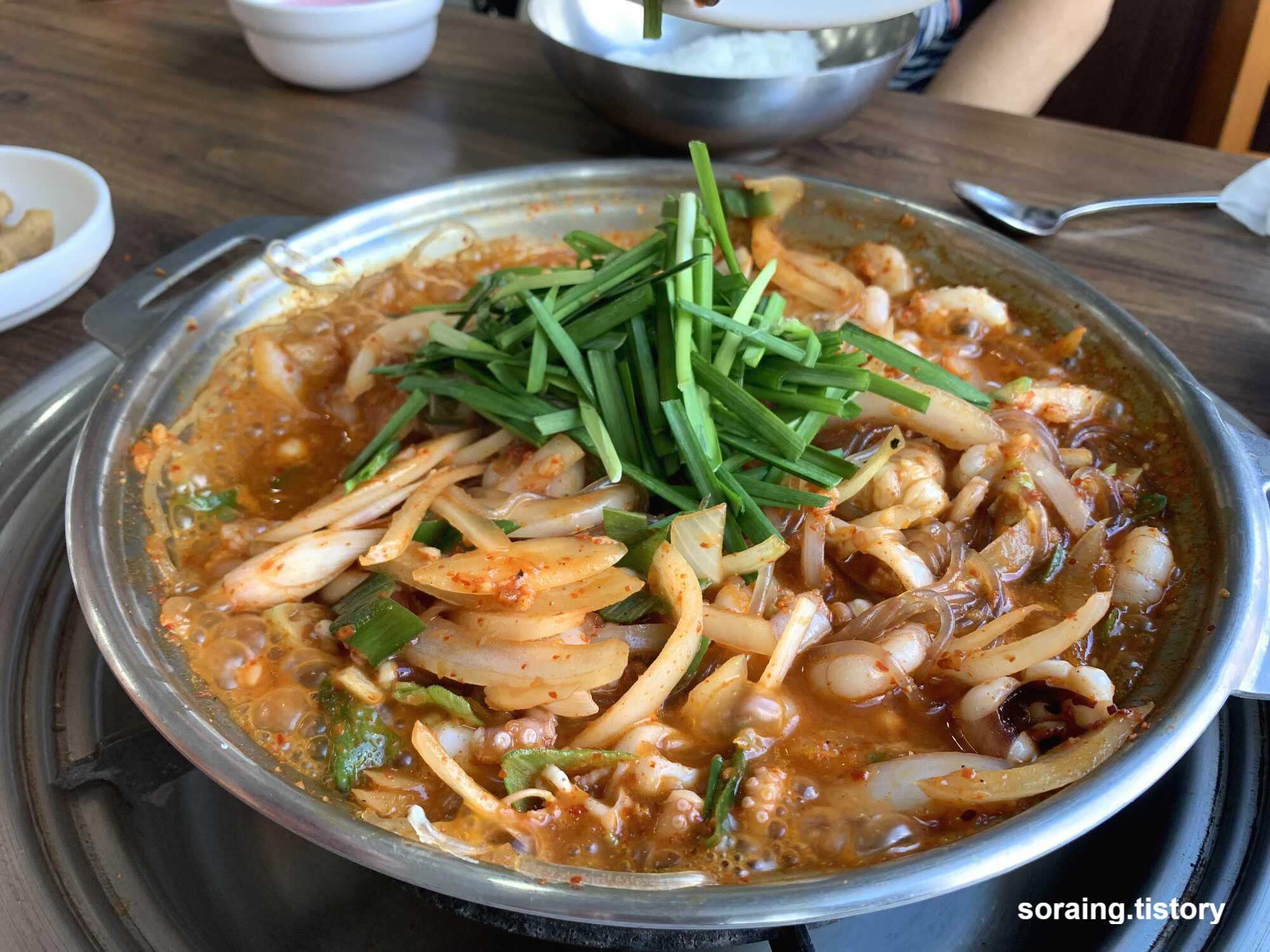 직원분들 모두 서빙의 달인인가, 잠깐 폰을 보는 사이 밑반찬과 낙곱새가 담긴 전골냄비가 차려졌다.
