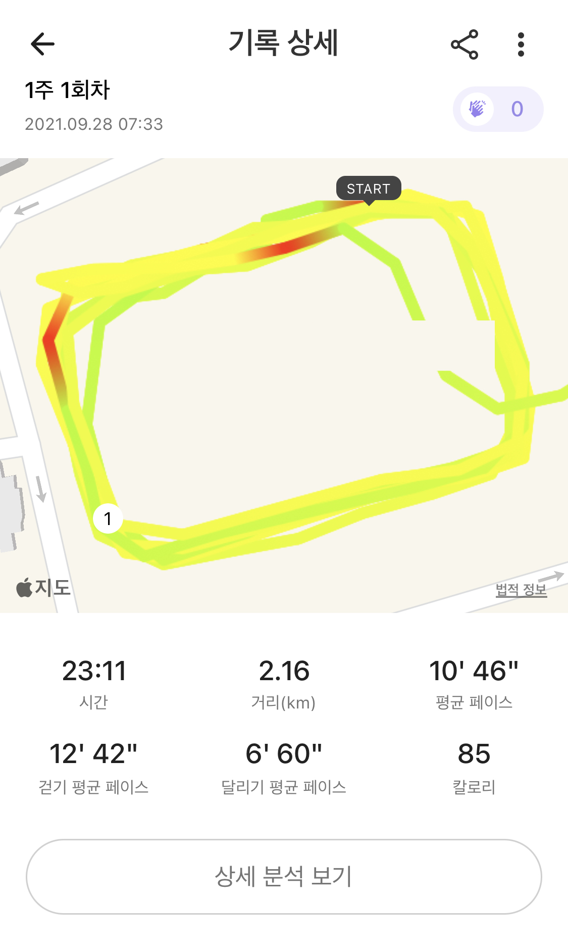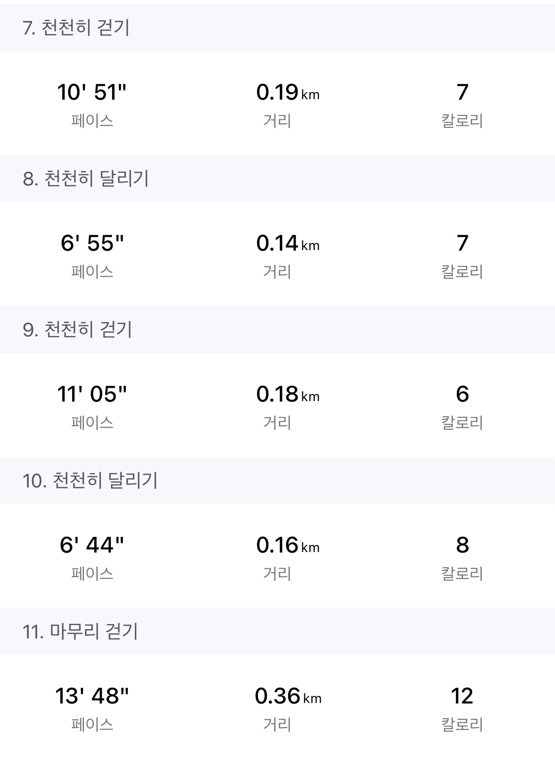 계절이 늦은 봄-여름에서 가을로 바꼈고 아침 기온은 꽤 낮았다. 21도 정도였는데, 운동장에 도착했을 때는 바람막이를 벗어나도 괜찮은 정도라 뛰는데 시원해서 좋았다.
