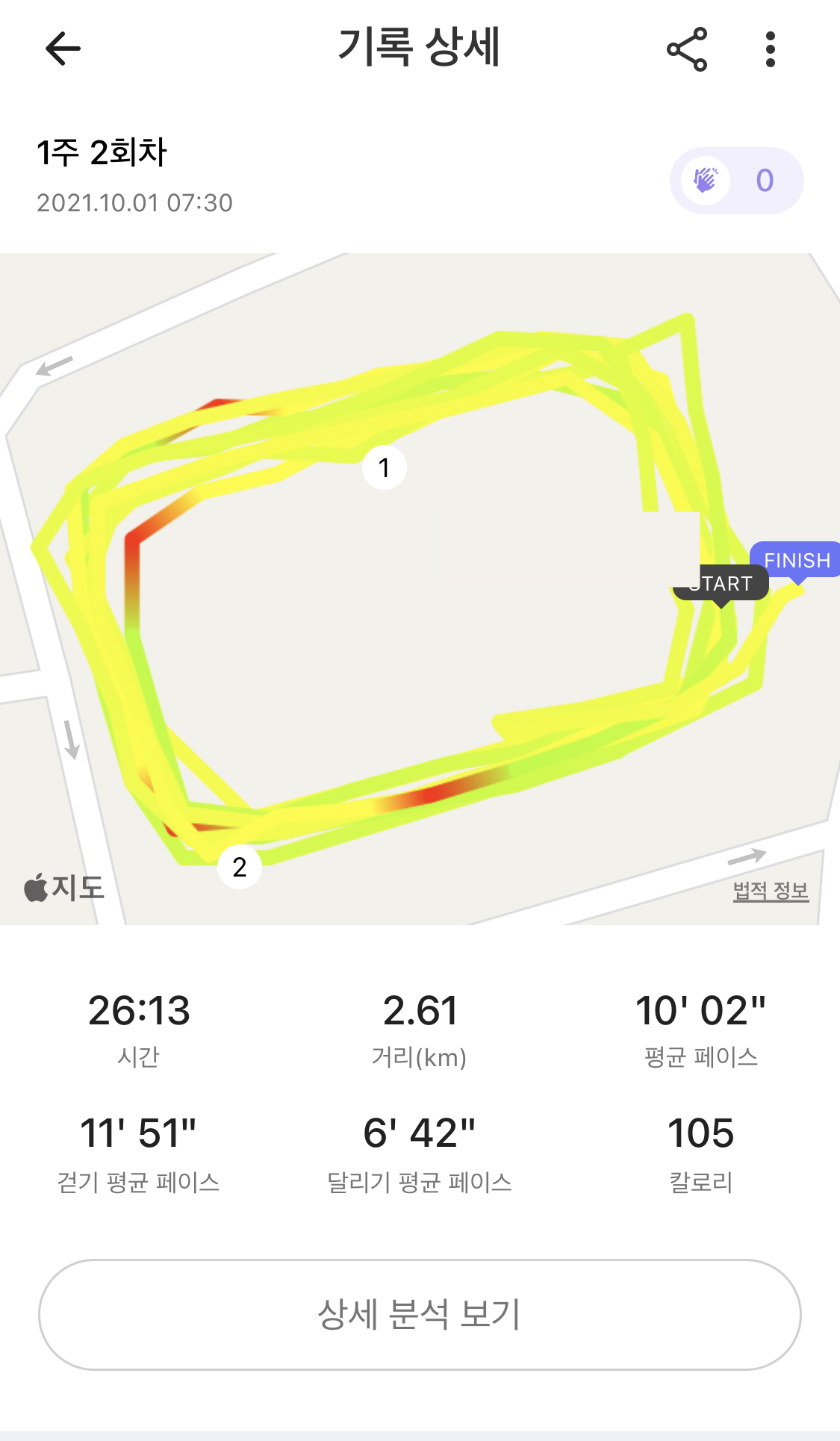 오늘 처음 달렸을 때 기록이 6분 6초로 제일 좋고 마지막 달리기가 7분 10초 페이스로 좀 쳐지긴 했지만, 중간에는 페이스 고르게 잘 달린 것 같다.