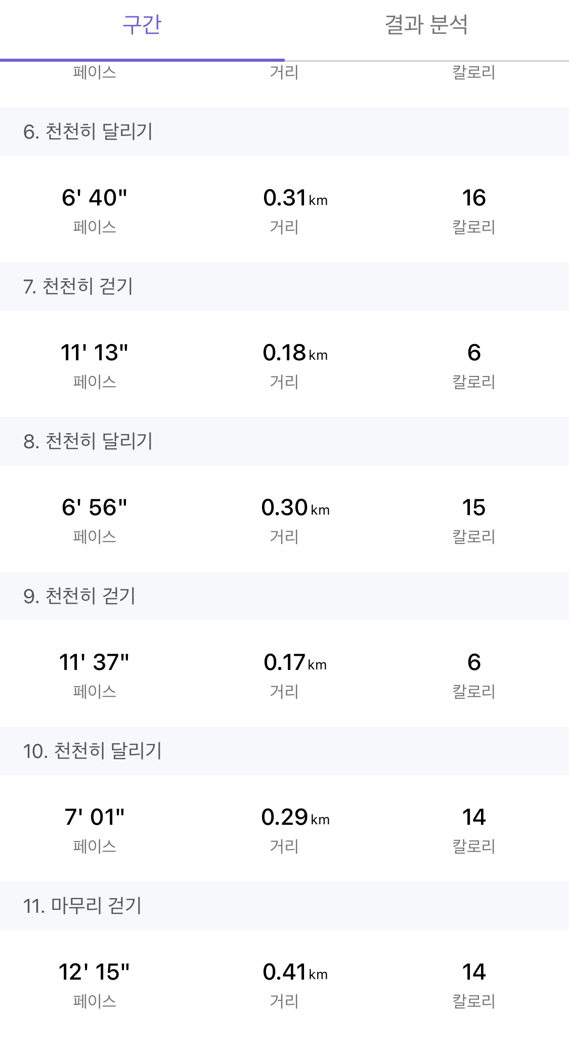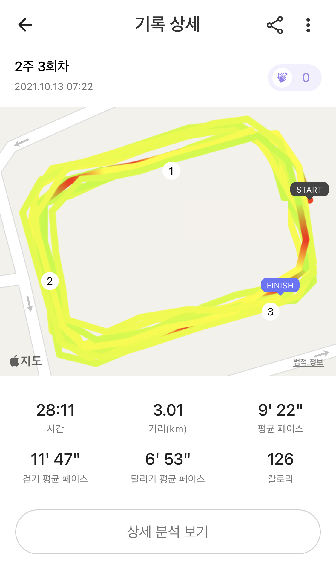 2-2회차 코스보다 뛰는 시간이 30초 늘었다. 대신 횟수는 -1회. 그래서인지 거리는 이틀 전 보다 짧다. 평균 페이스는 16초 단축했다. 걸을 때 페이스가 좀 빨랐던 것 같다. 달리기 평균 페이스는 7초 늦어졌으니까. ㅠㅠ