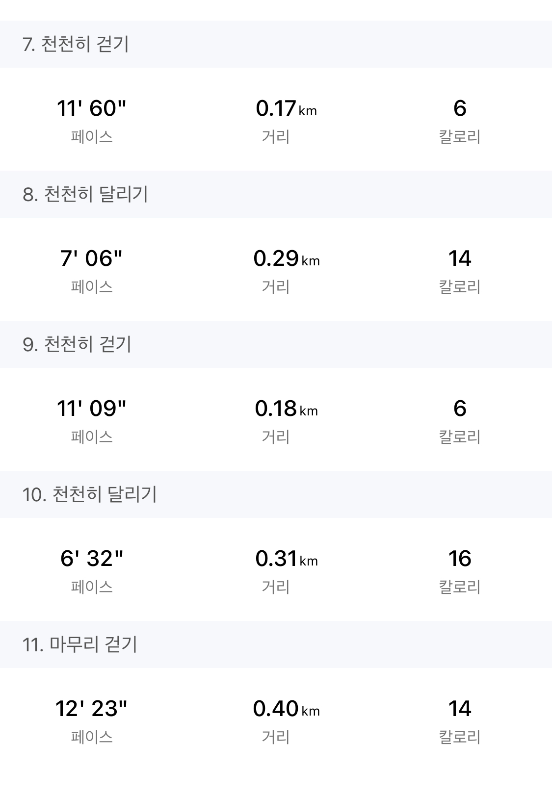 걷기 평균 페이스가 좀 늘었다. 그래서 전체 평균 페이스는 2초 늘었다. (아쉬워라) 그래도 달리기를 빠르게 잘, 고르게 달렸으니 된 거 아닐까? 8번 달리기(네번째 달리기)가 유달리 늦었다. 이유는 모르겠다.