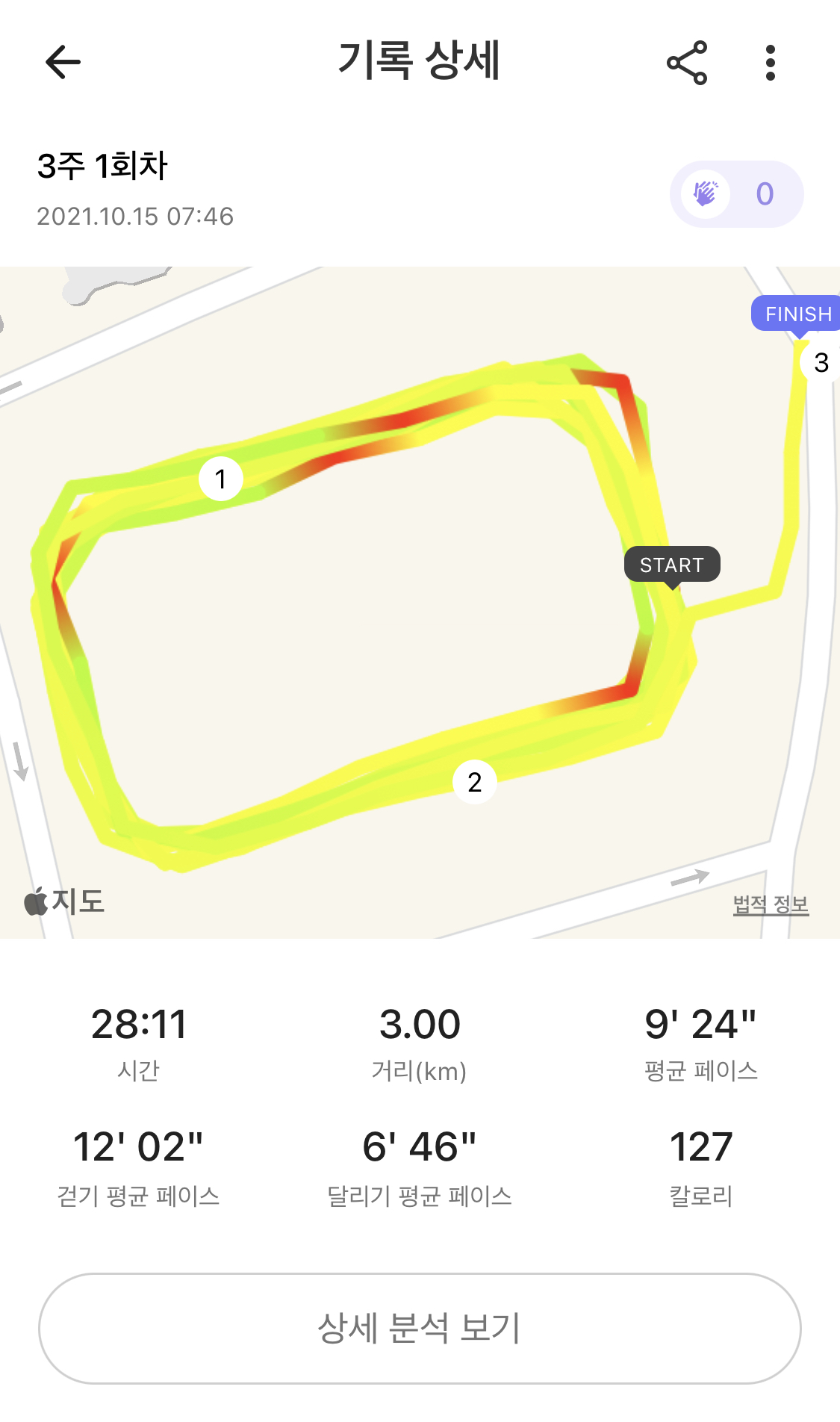 2-3회차랑 똑같은 코스였다. 달리기 평균 페이스가 7초 정도 단축되었다. (짝짝짝)