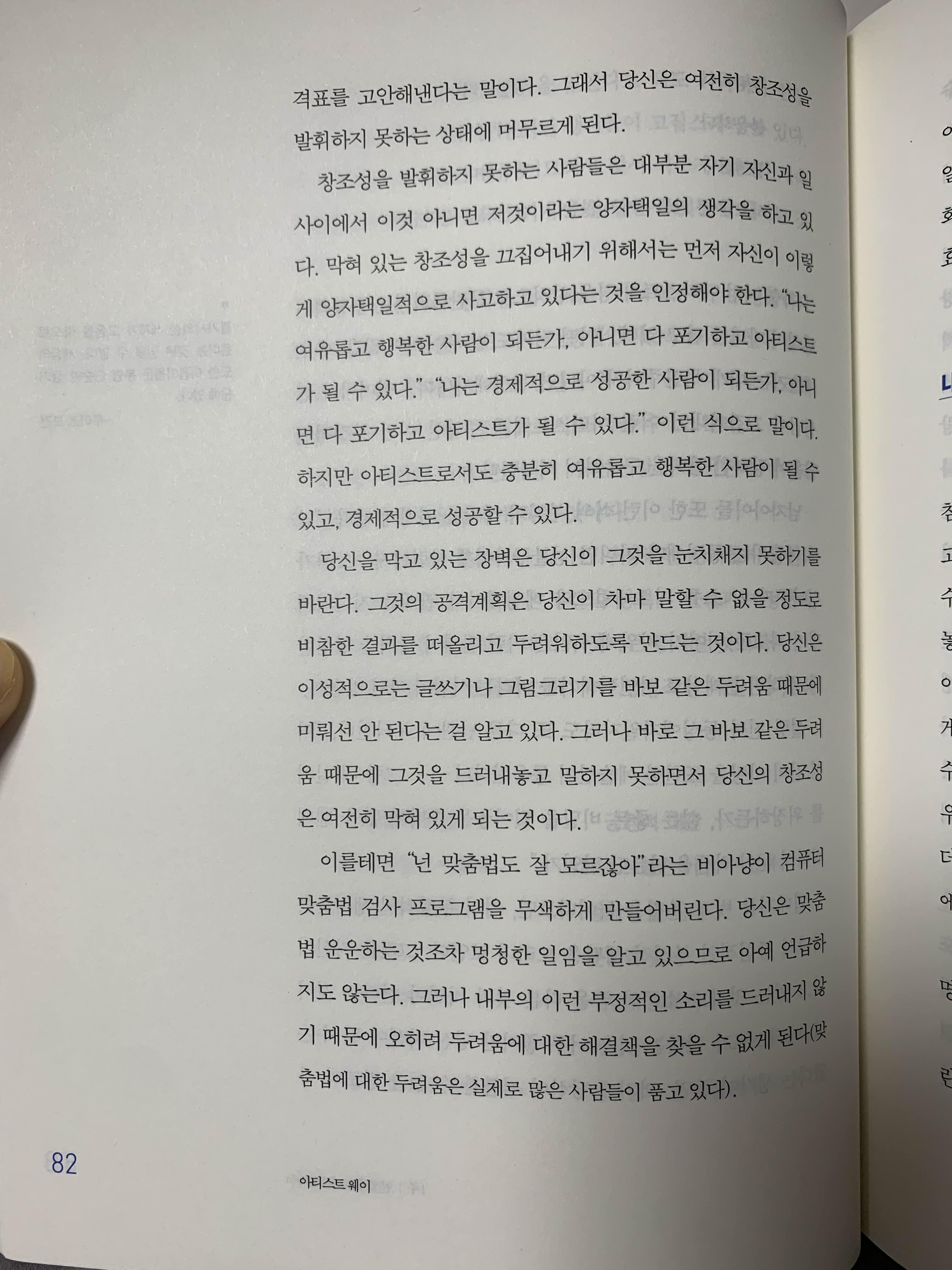 창조성을 발휘하지 못하는 사람들은 대부분 자기 자신과 일사이에서 이것 아니면 저것이라는 양자택일의 생각을 하고 있다. 막혀 있는 창조성을 끄집어내기 위해서는 먼저 자신이 이렇게 양자택일적으로 사고하고 있다는 것을 인정해야 한다. "나는 여유롭고 행복한 사람이 되든가, 아니면 다 포기하고 아티스트가 될 수 있다." "나는 경제적으로 성공한 사람이 되든가, 아니면 다 포기하고 아티스트가 될 수 있다." 이런 식으로 말이다. 하지만 아티스트로서도 충분히 여유롭고 행복한 사람이 될 수 있고, 경제적으로 성공할 수 있다.