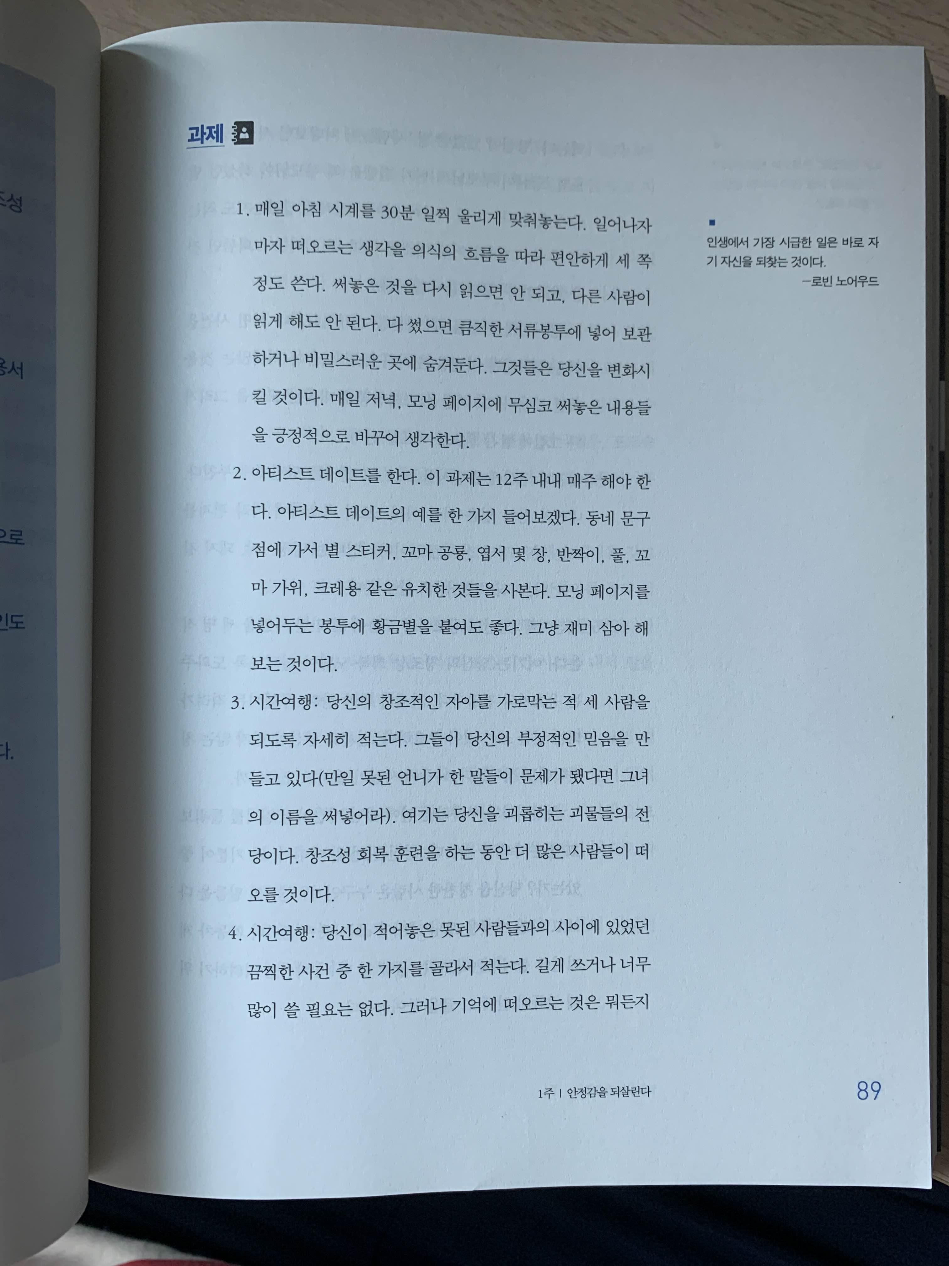 창조성 회복을 위해 매일 아침, 모닝 페이지를 쓰고 일주일에 1번 아티스트 데이트를 해야 한다. 그리고 매주 주어지는 과제를 하고, 한주가 끝나는 요일에는 점검을 해야 한다.