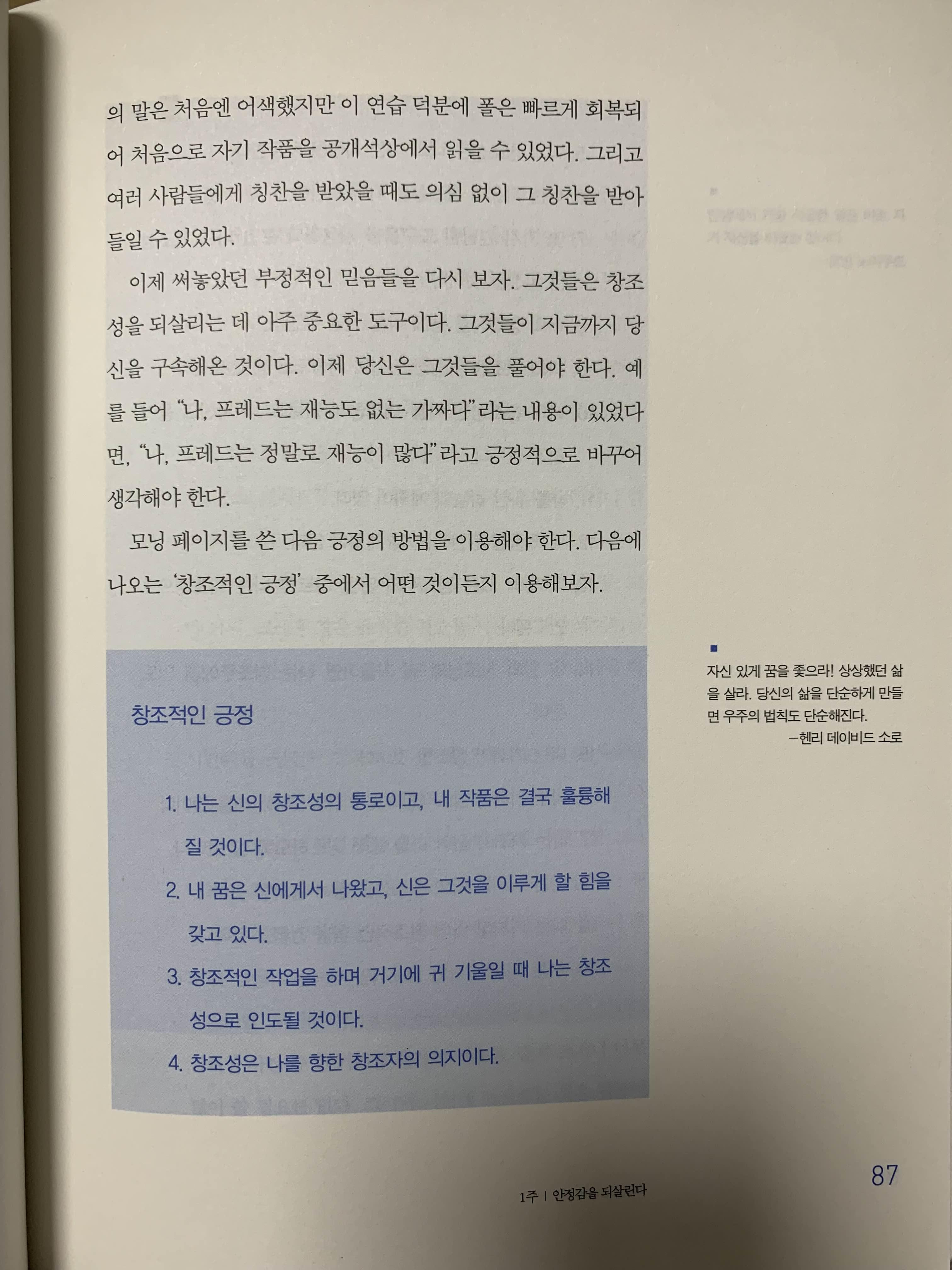 1주 차에서 작가님이 말하는 것처럼 우리가 창조성을 잃은 이유는 나부의 적, 내 자신이 제일 큰 원인일 수도 있겠단 생각이 든다. 나부터 나 자신을 믿고 긍정해야겠다.