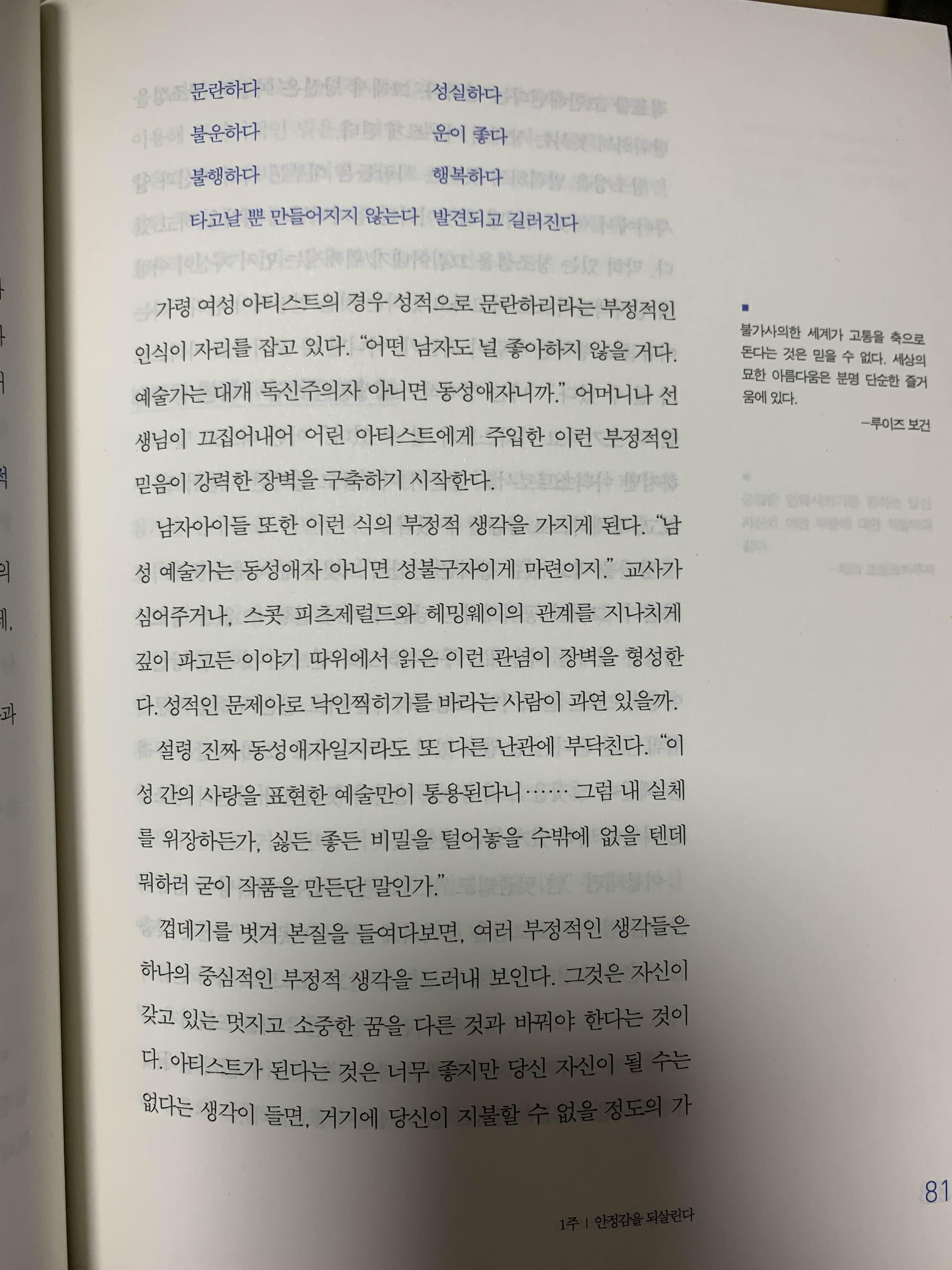 나를 위한 12주간의 창조성 워크숍 <아티스트 웨이>는 12주간 커리큘럼으로 구성되어 있다. 매주마다 소주제가 있고, 그에 대한 내용을 저자의 경험이나 주변인의 사례로 풀어준다.