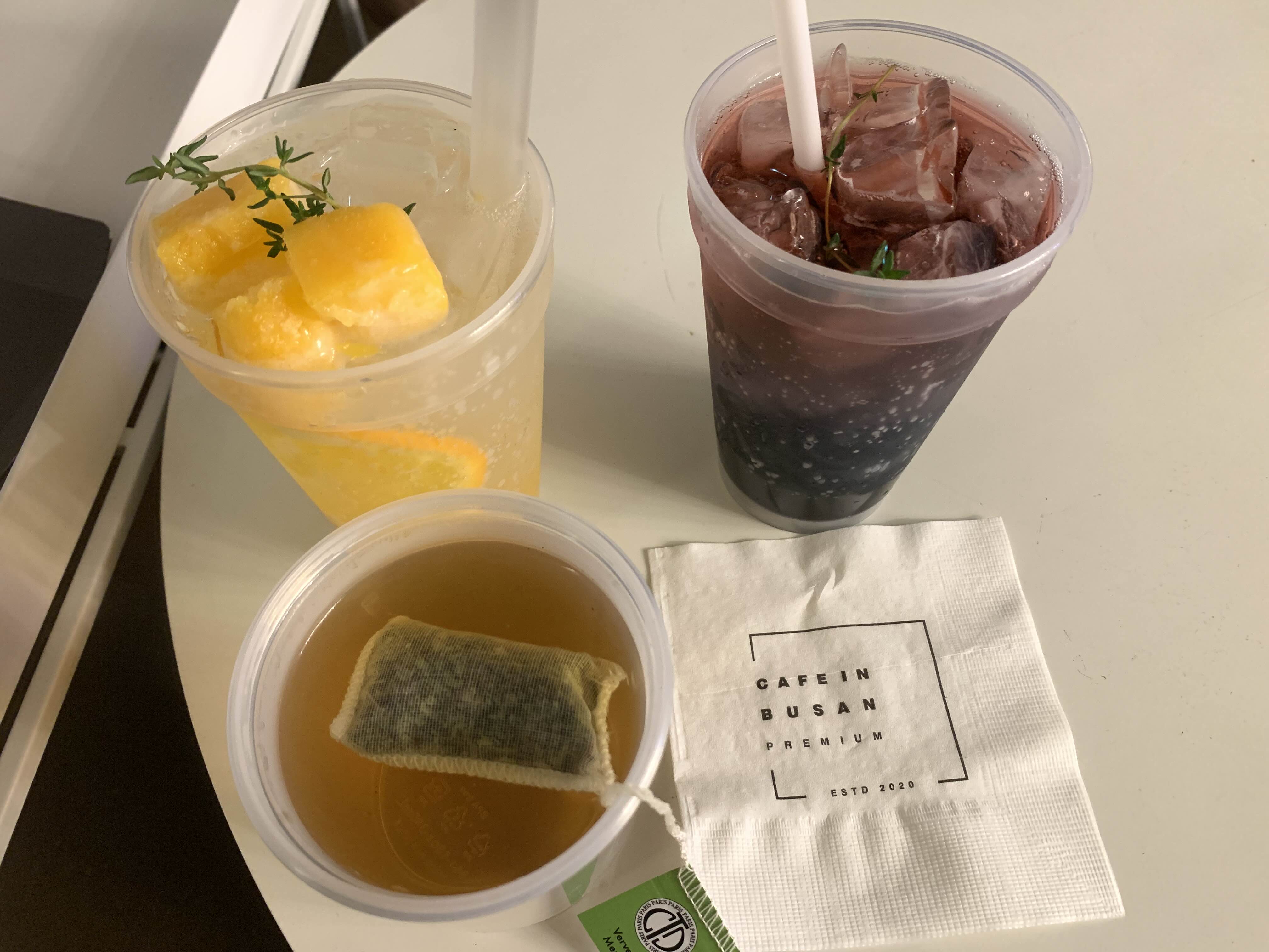 아래 사진 왼쪽부터, 오렌지 동산 에이드, 블루 라즈베리(?) 에이드, 아래쪽은 버베인 멘테(민트 티인 듯하다).