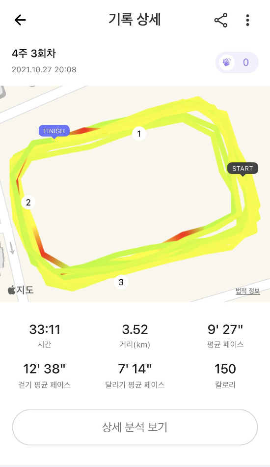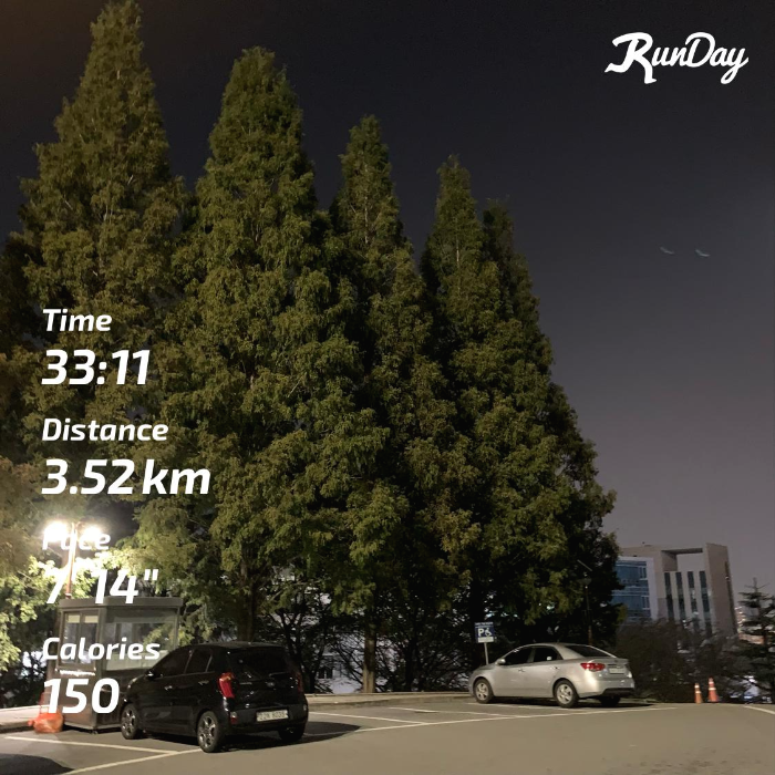 달리기 시간이 30초 늘어나서 3분이지만 다섯번이라서 할 만 했다. 6번 뛰는 건 뭔가 힘들다. 겨우 한번 더 뛰는 건데도. 오늘은 가벼운 마음으로 뛰긴 했는데 속도가 어떤지 모르겠다. 중간에 오른쪽 종아리도 땡겨서 혼났다. (멈출 위기!)