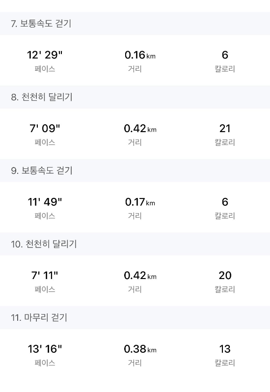 걷기 평균 페이스는 느려졌지만, 아마도 준비-마무리 걷기 때문인 것 같다. 워밍업, 쿨다운 빡세게 안해도 될테니까, 괜찮다.