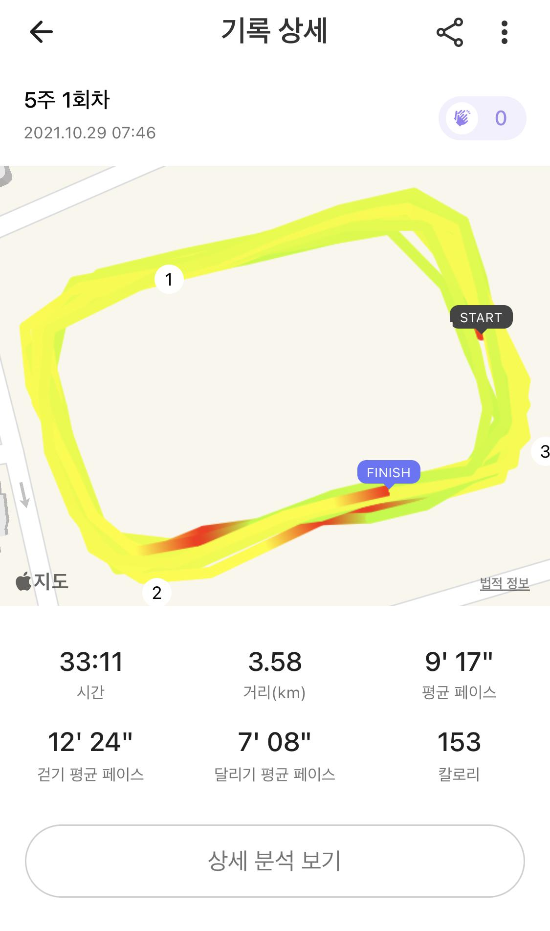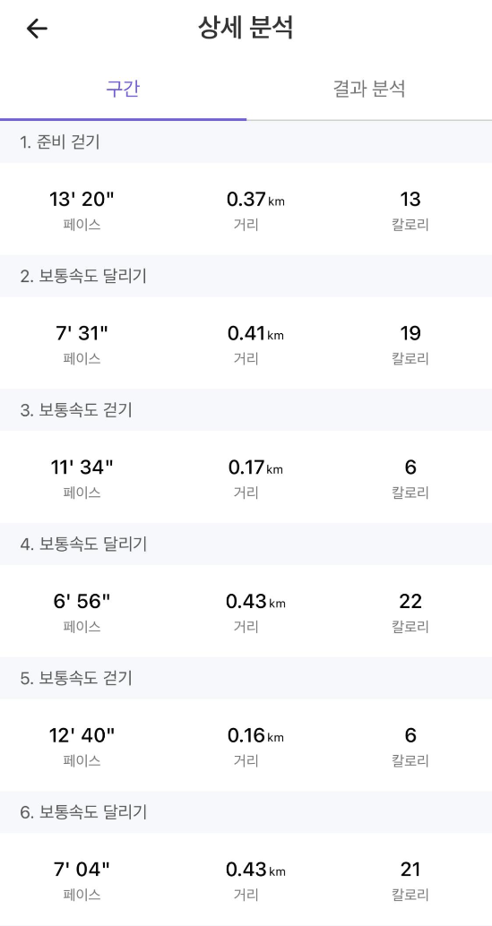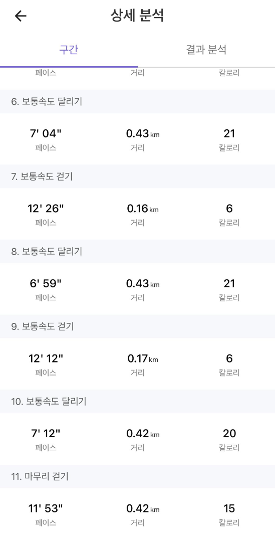오늘은 전회차랑 똑같은 코스, 운동량이지만 걷기와 달리기 모두 평균 페이스 단축!! 짝짝짝. 몇초라도 단축한 게 어디야, 기특해!