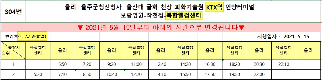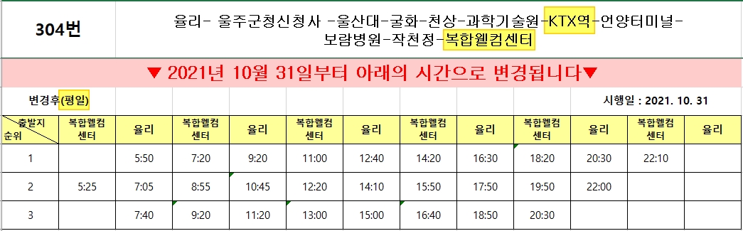 부산역에서 기차는 거의 매 10분마다 있어서 출발 시간만 정하면 된다. 울산역에서는 복합웰컴센터로 가는 버스가 두 대 있다. 304번과 323번. 323번은 하루 6회 정도, 304번은 하루 10회 운행한다고 한다. 아래 304번 버스 시간표를 참고!