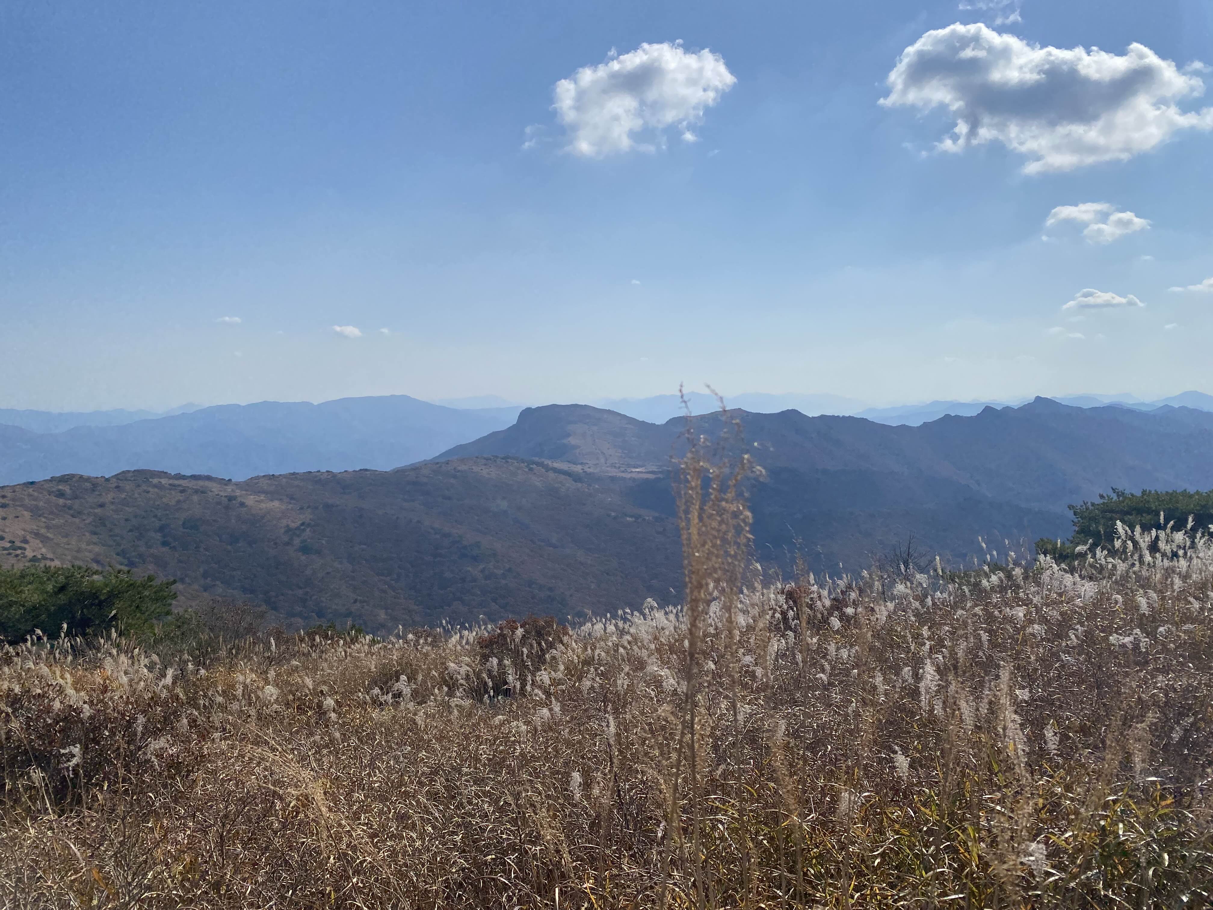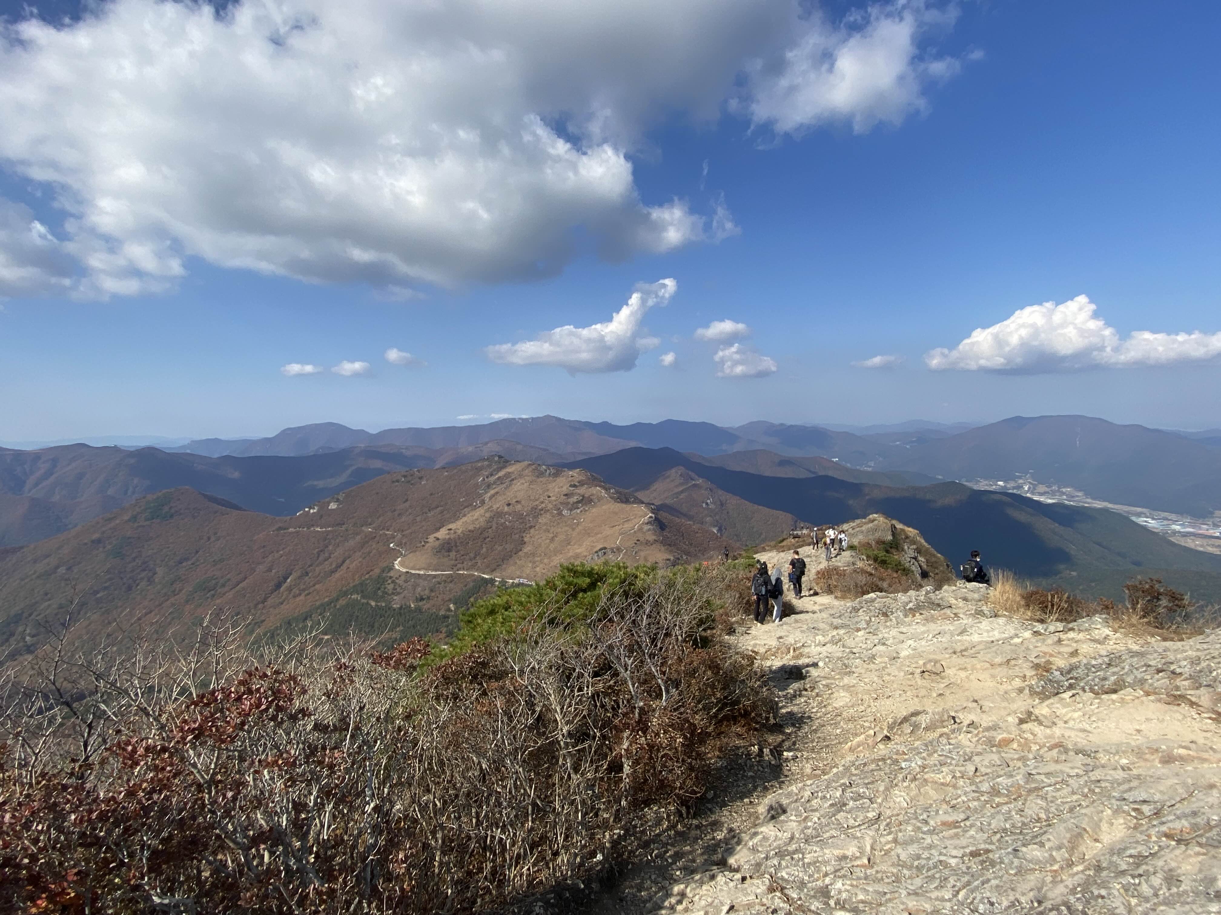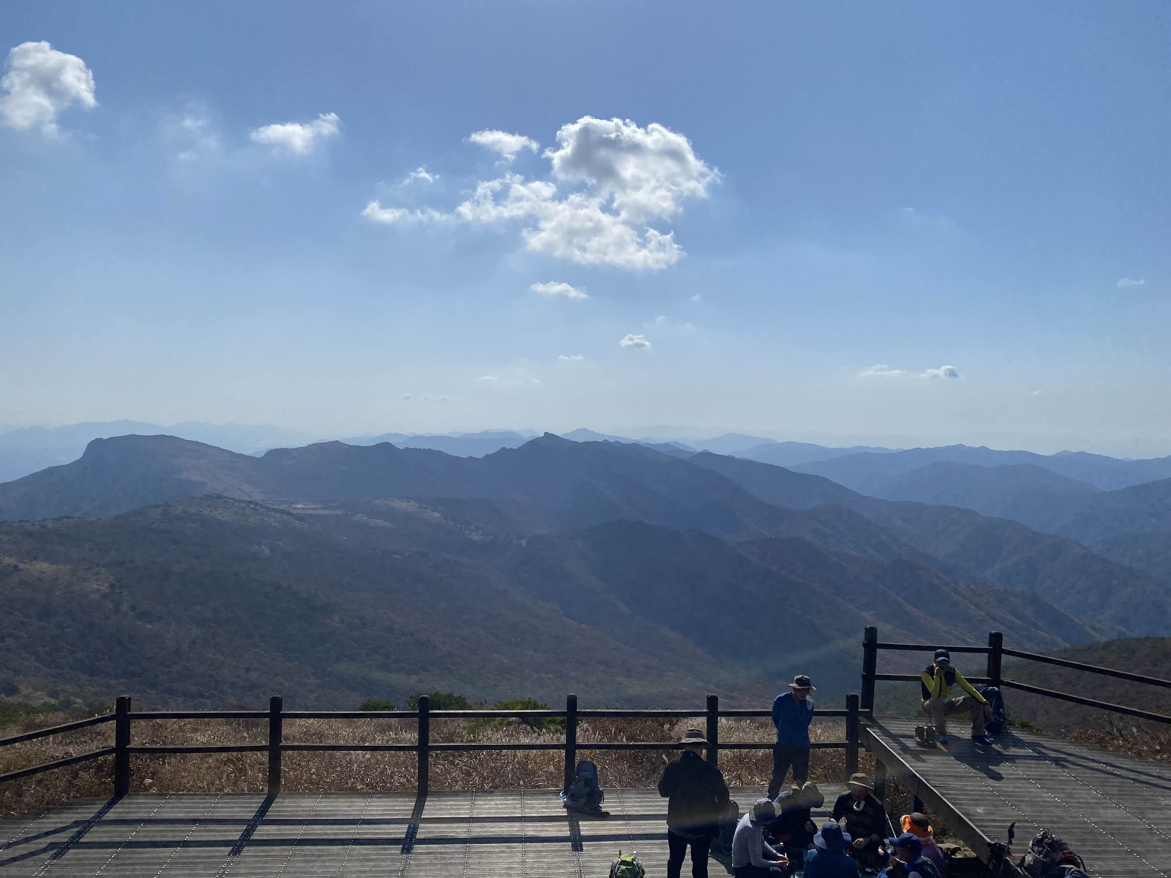 신불산 정상에는 따로 매점은 없다. 서치 할 때 산 오르면 중간에 매점 있다고 하더니, 신불산은 아니었나 보다. 입에 뭐가 좀 들어가니 경치가 눈에 들어온다. 3시간 정도 걸려서 도착한 신불산 정상은 참 멋들어졌다. 산 능선이 어찌나 우아하고 깊은지-! 여기가 신불산 정상 맛집이구나 싶었다.