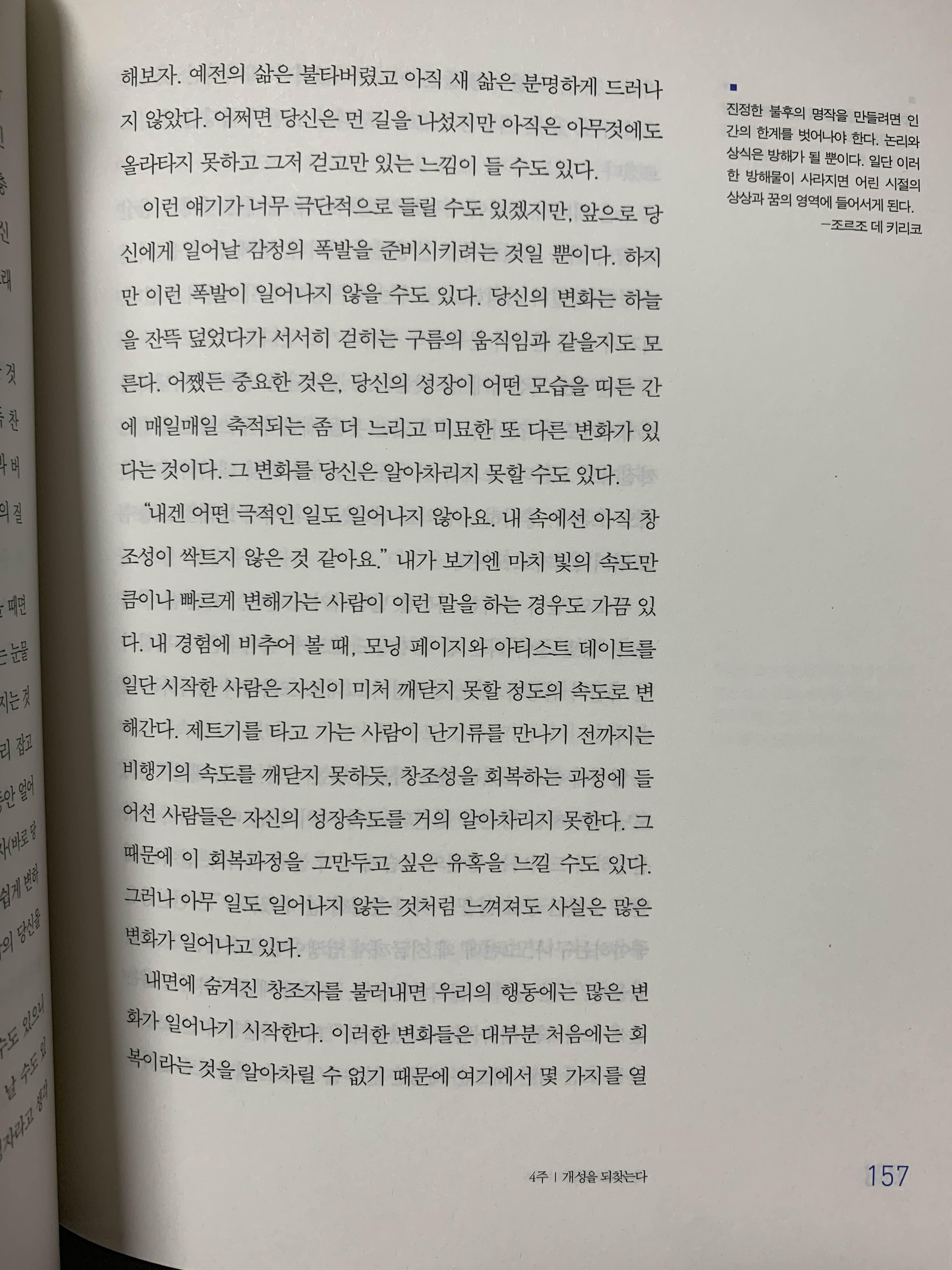 이번주 책속의 한줄에서 설명한 것처럼 변화가 크지 않을지라도 미묘하게 나는 바뀌고 있을까, 궁금하다. 조금 더 많은 아티스트 데이트를 하고, 시간을 가져야겠다. 모닝페이지를 쓰고 있지만 마음 가짐이 처음보다 풀어진 것 같다.