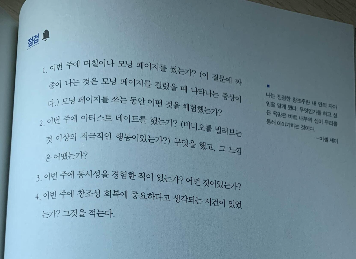 이래저래 바빠서 모닝페이지도 빼먹고, 주별 과제랑 점검도 늦었다.