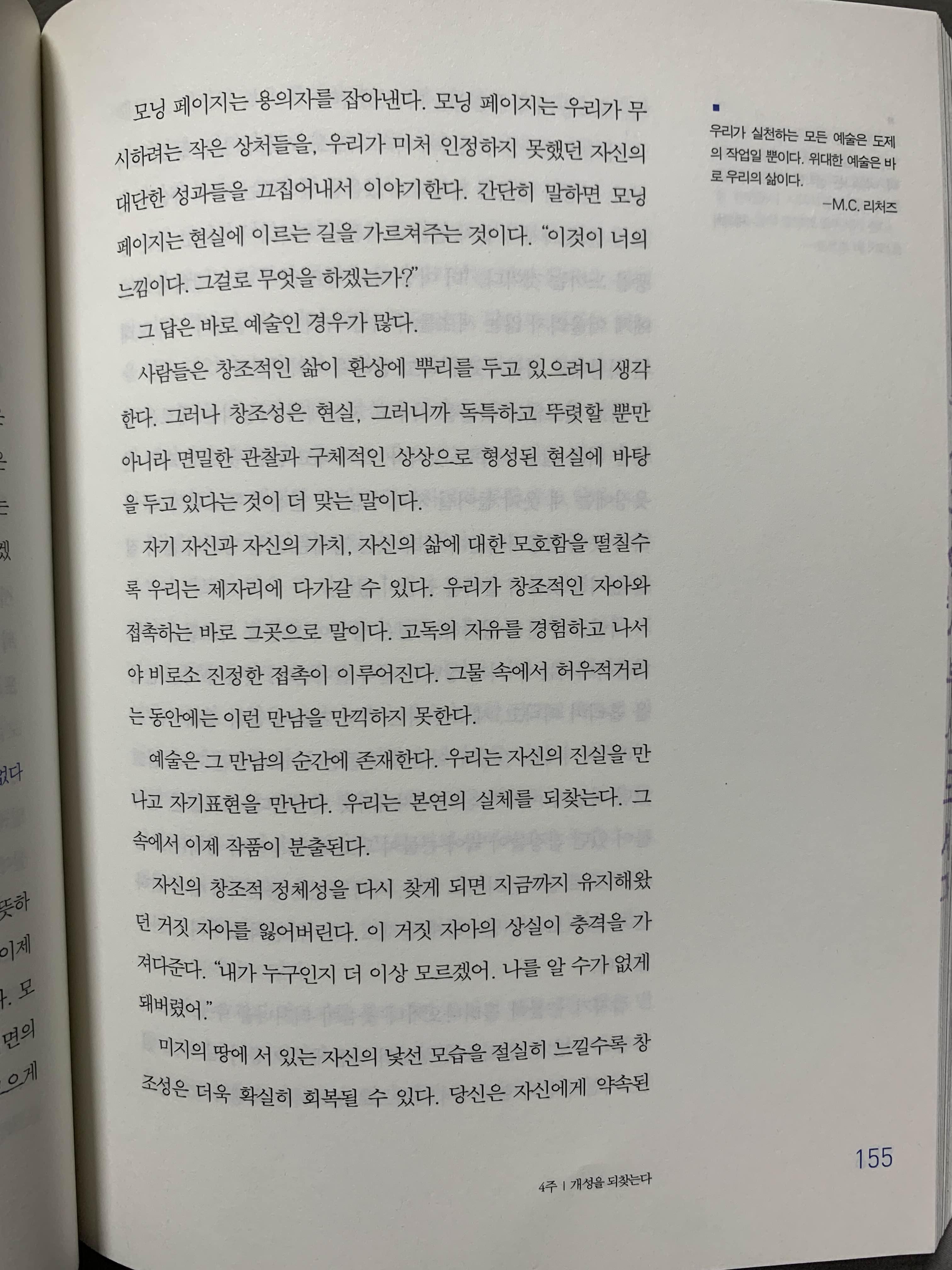 모닝 페이지는 우리가 무시하려는 작은 상처들을, 우리가 미처 인정하지 못했던 자신의 대단한 성과들을 끄집어내서 이야기한다. 간단히 말하면 모닝 페이지는 현실에 이르는 길을 가르쳐주는 것이다.