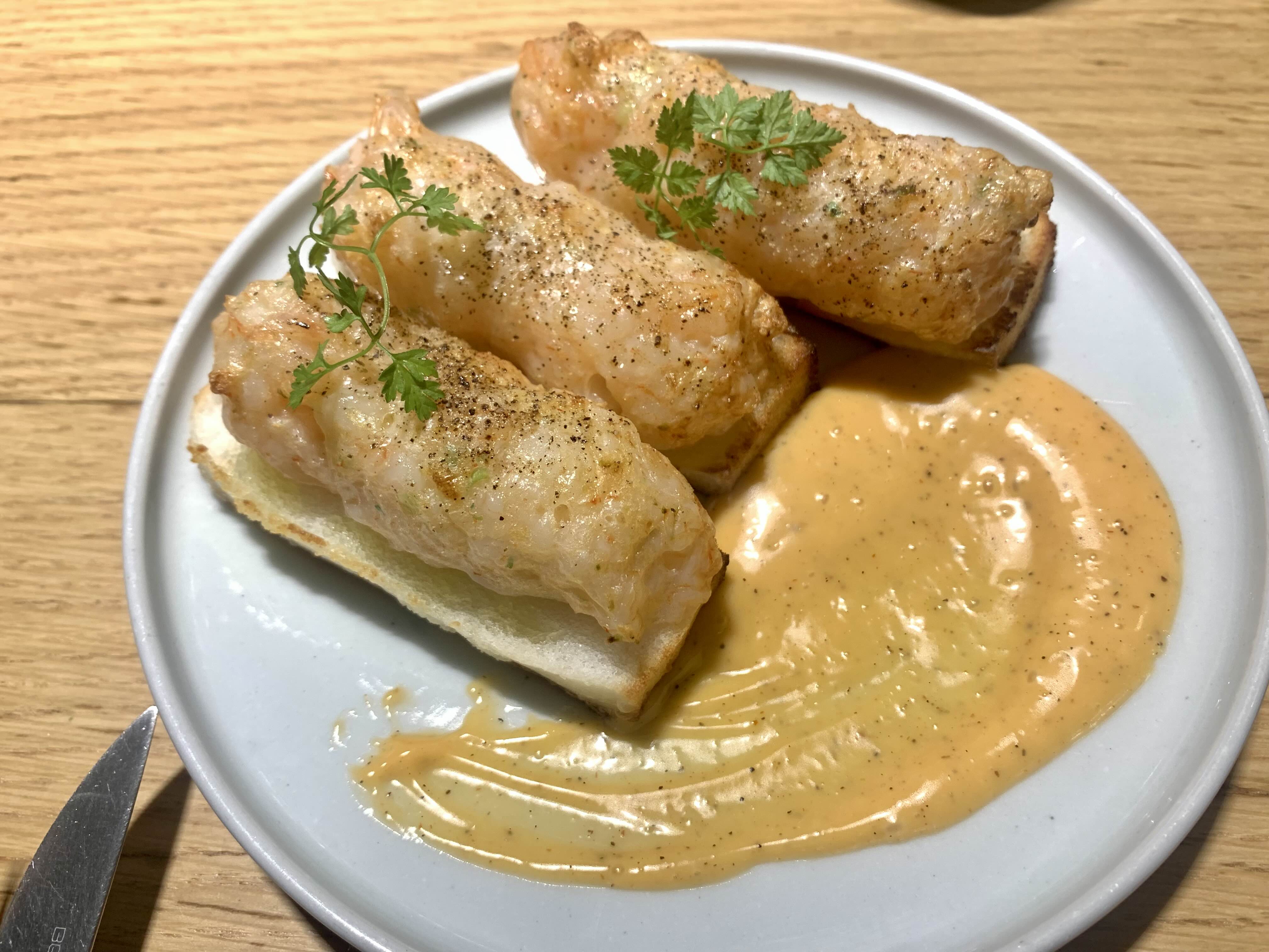 와, 멘보샤 많이 먹어보진 않았지만 정말 맛있었다. 여태껏 먹었던 멘보샤 중 최고다. 일단 밑에 깔린 빵은, 일반 식빵이 아니라 직접 반죽한 증편이었다. 그리고 오동통한 새우살이 입안 가득 씹히는데, 정말 맛있었다. 부드럽고 폭신폭신 쫄깃쫄깃한 식감이 좋았다.