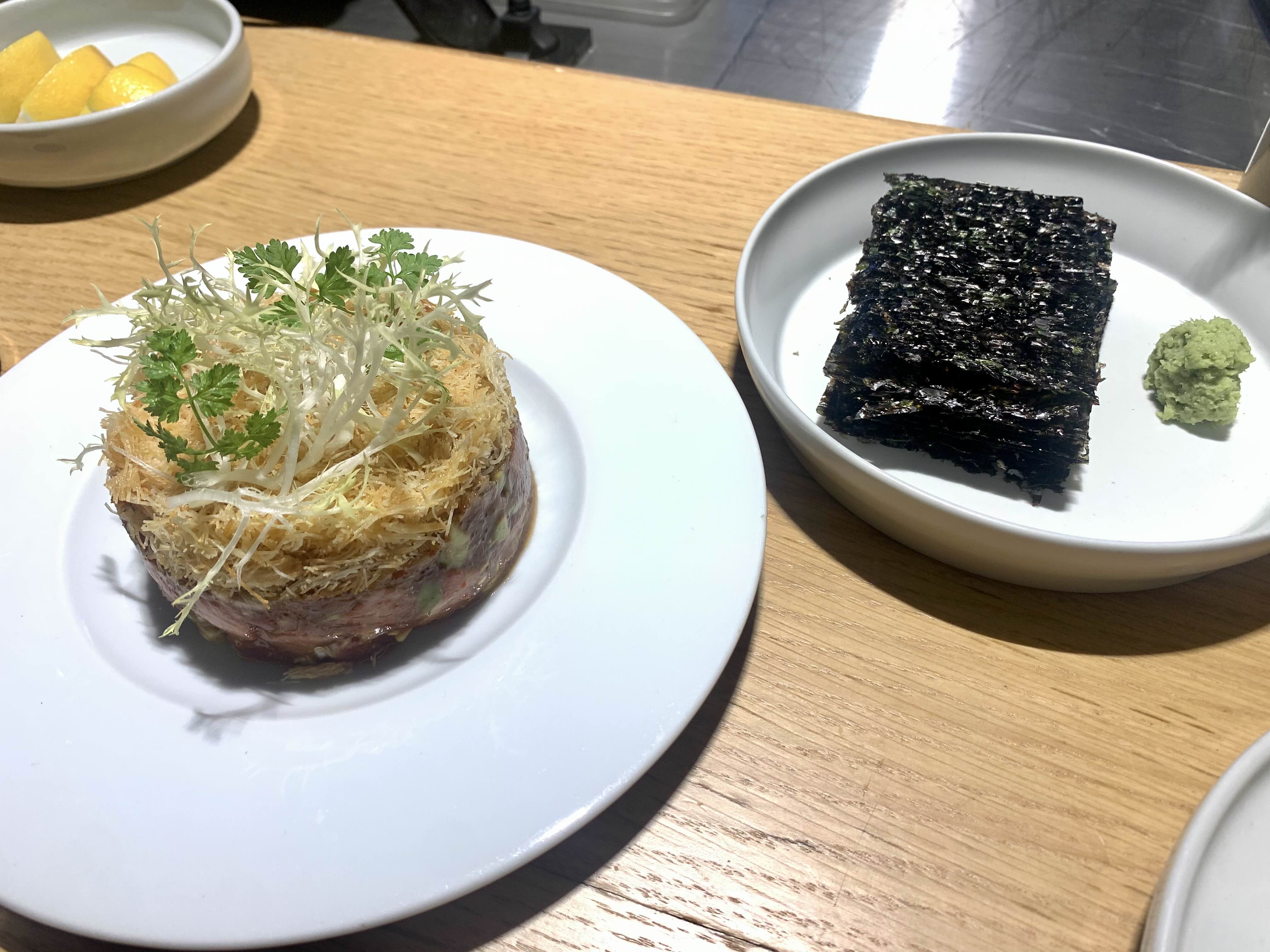 무슨 예술작품처럼 예쁘게 쌓아 올려진, 참치 타르타르 케이크(?)가 나왔다. 바삭바삭하고 고소한 카다이프와 부드러운 참치살은 씹을 때의 식감이 재밌다. 그냥 이렇게만 먹어도 맛있는데, 함께 먹으라고 김과 고추냉이가 나왔다.