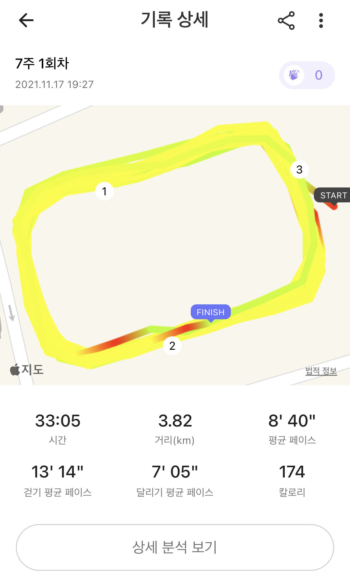 오늘은 달리기가 10분씩 두 번인데, 의외로 잘 달린 것 같다. 몸에 무리도 없었고- 특히 무릎이나 발목도 괜찮았다. 집에서 발목 스트레칭을 해준 게 도움이 된 것 같다. 첫 번째 달리기에서 힘들지 않았던 것 같아서 두 번째 달리기도 힘 빼지 않고 달렸다. 그게 좀 빠른 속도로 이어졌나 보다. 달리기 페이스가 각각 20초 차이라니, 조금 아쉽다. 비슷하게 달려야 하는데. 그래서 그런지 후기를 쓰는 지금 다리가 너무 당긴다. 빨리 마무리하고 자기 전에 마사지 좀 해줘야겠다.