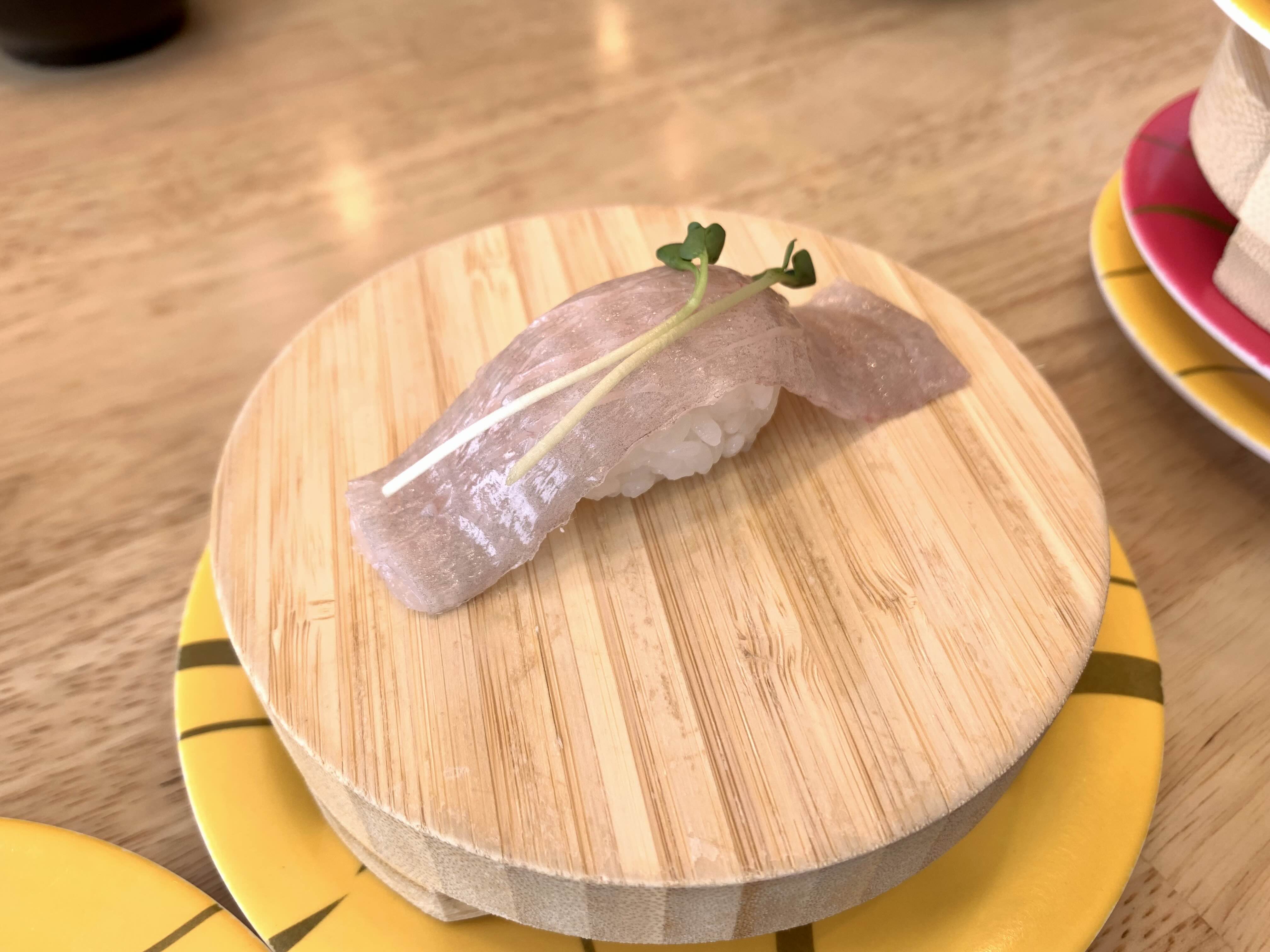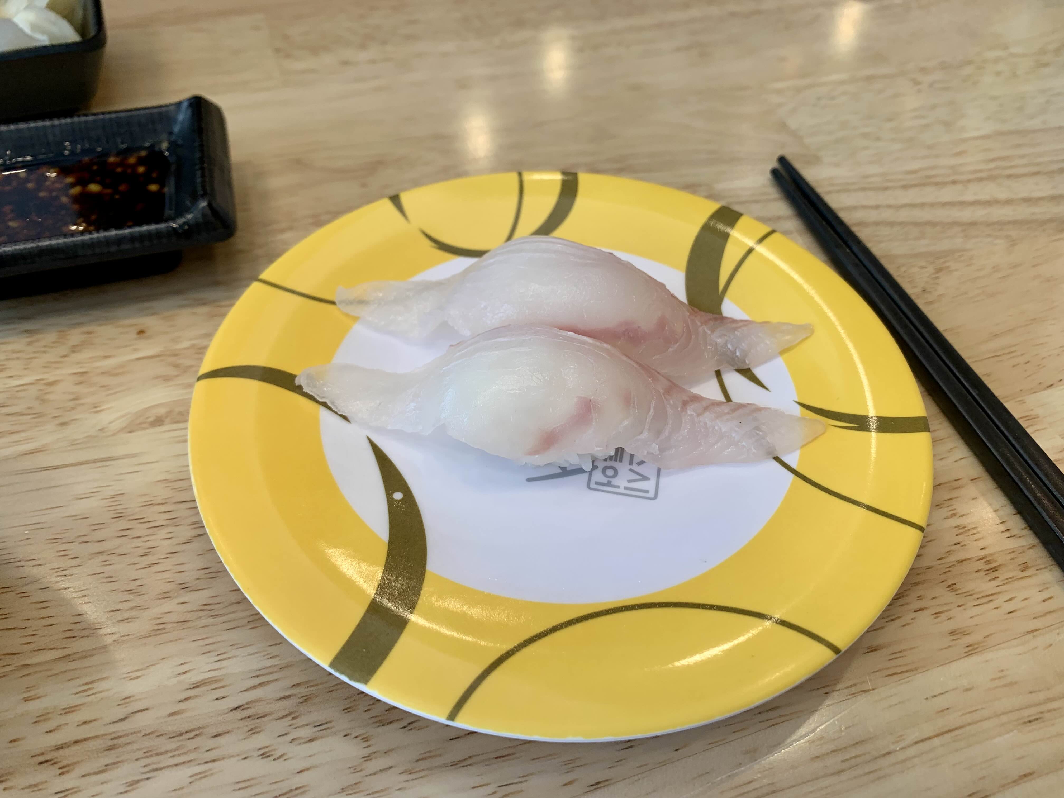 초반에 두점씩 먹다가, 나중에는 하나만 올려져 있는 뭔가 스페셜한 느낌이 드는 접시를 골랐다. 광어인지, 밀치인지 어느 생선의 뱃살인 것 같다. 그리고 참돔 초밥을 먹었다.