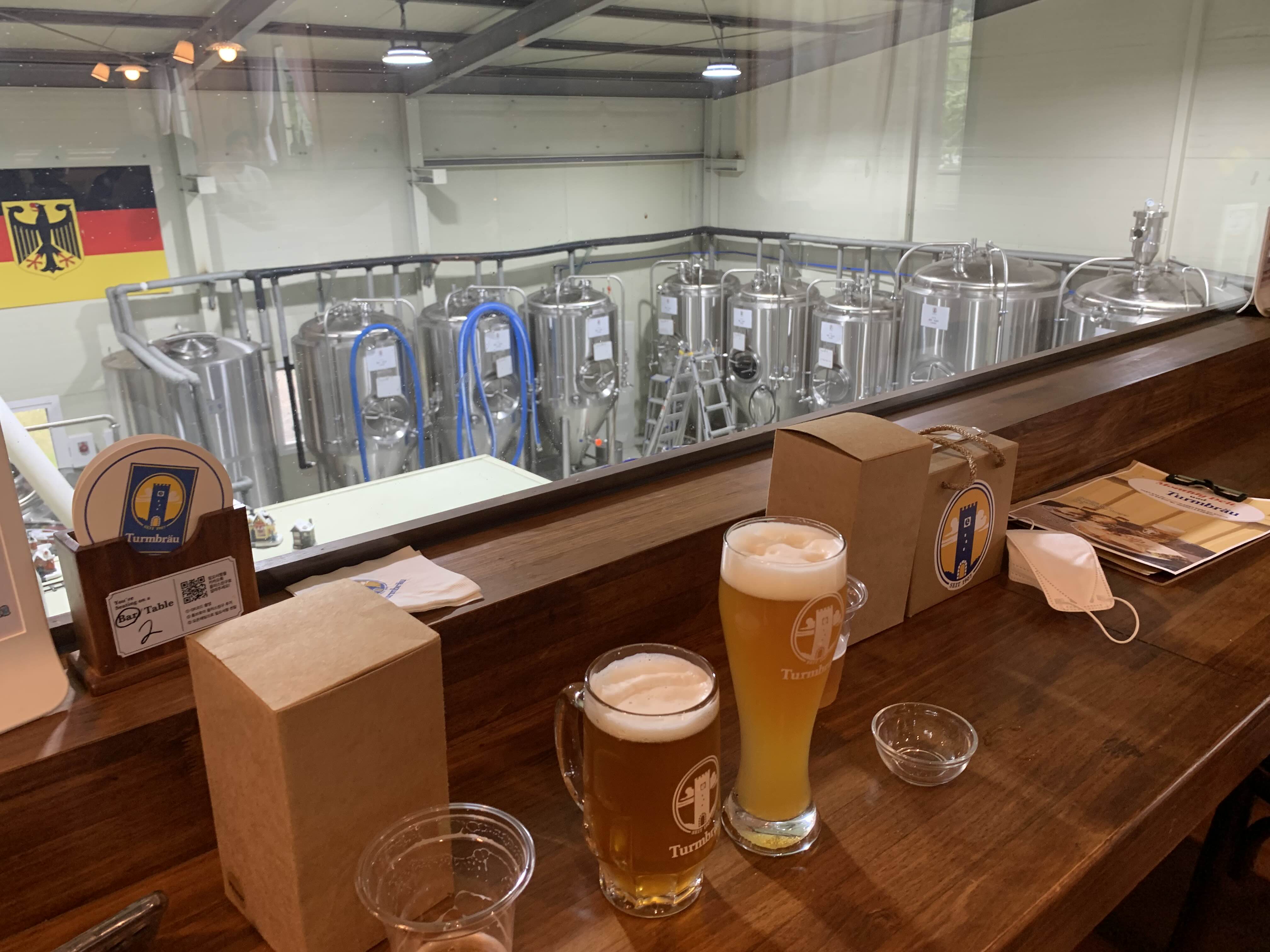 우리는 양조장이 내려다 보이는 벽면 바 테이블에 앉았다.