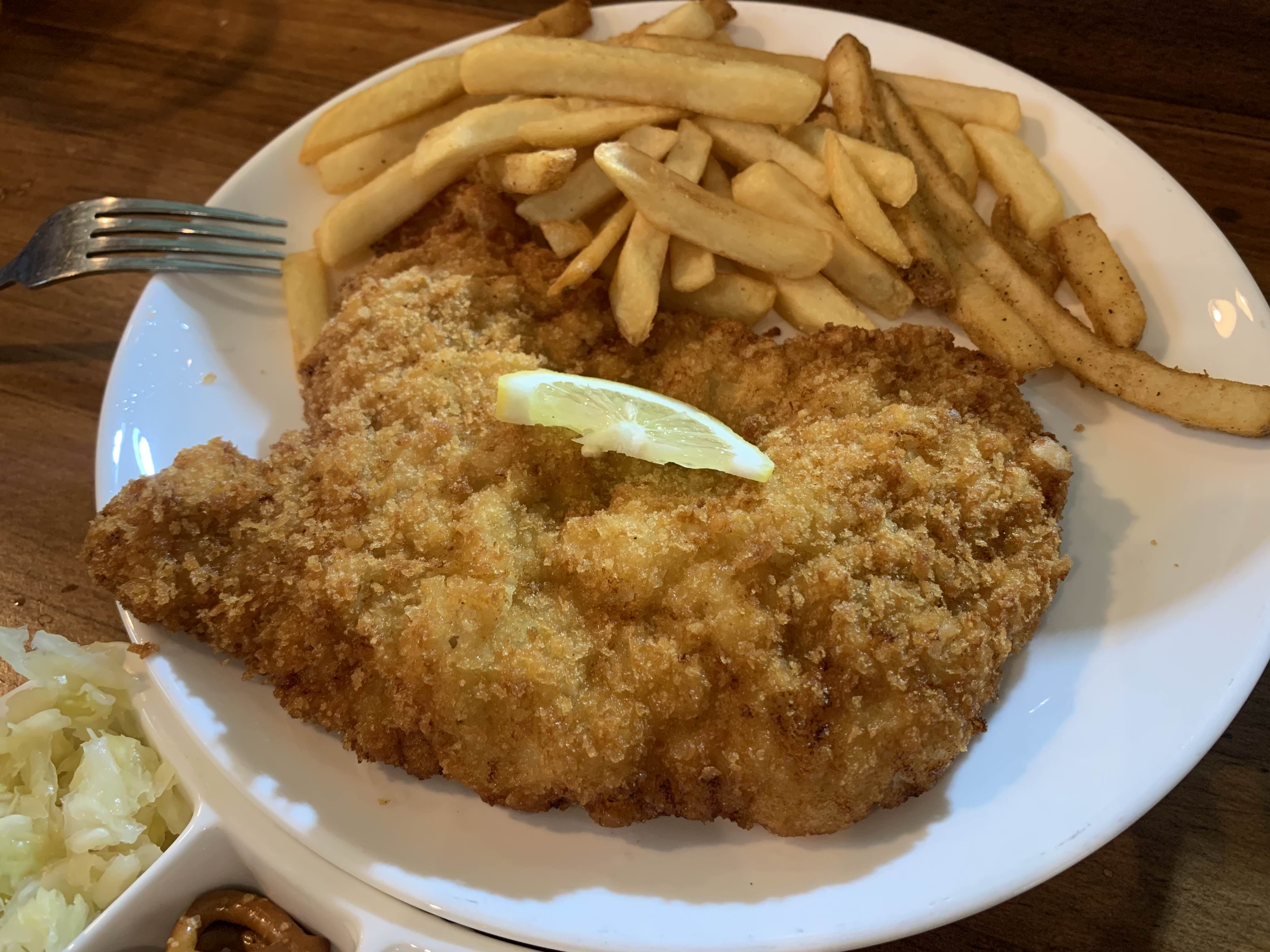 독일 가정식 돈가스라는 슈니첼은 의외로 고기가 얇고 튀김옷은 바삭해서, 치킨 튀김옷을 좋아라 하는 사람들이라면 툼브로이 슈니첼도 좋아할 것 같단 생각이 들었다. 나의 최애 맥주 안주는 감자튀김인데, 슈니첼과 감튀가 같이 나와서 만족스러웠다.